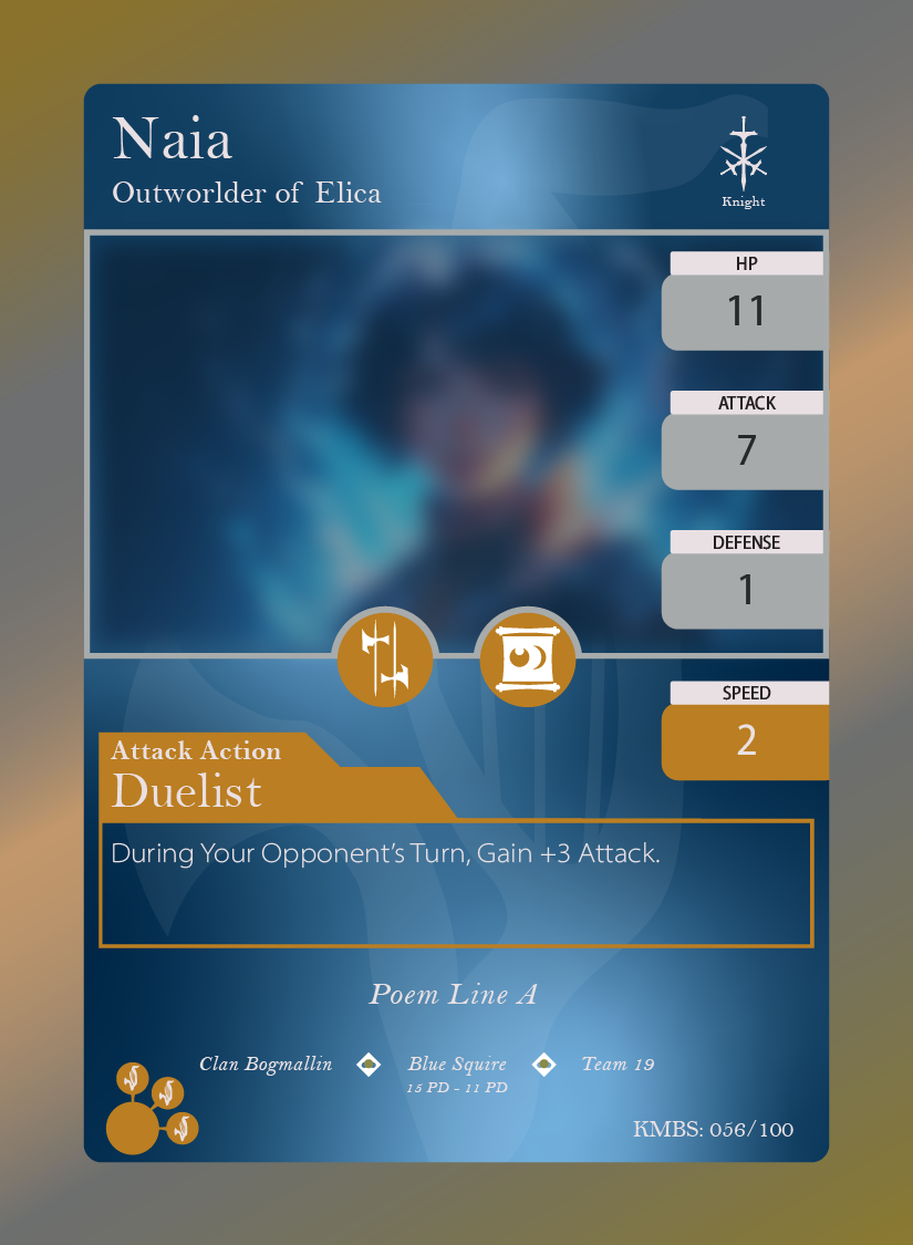 Naia is a 24 year old Nuwe (female) from the Bogmallin Clan. Her clan is located in The Bog, which is in the region of Elica, and borders the marshlands of the Gemyn region. Upon completing the Trials of the Palazar, she receives an Alter Mark, and is deemed an Outworlder. Naia loves her people and believes it is her destiny to protect them. The Alter Mark she bears is a source of shame, as her people misinterpret her heroic intentions as having ulterior motives. Her uncle Garrett, with whom she is very close, was the last Blue Knight before the Emblems became dormant. She is incredibly driven, but not to the point of recklessness. She is allergic to most animals, and is working towards a Free Contract with a Puffer Free named Gaspar, who is a bit of an ass. In a fight, she prefers to face her opponent one-on-one.